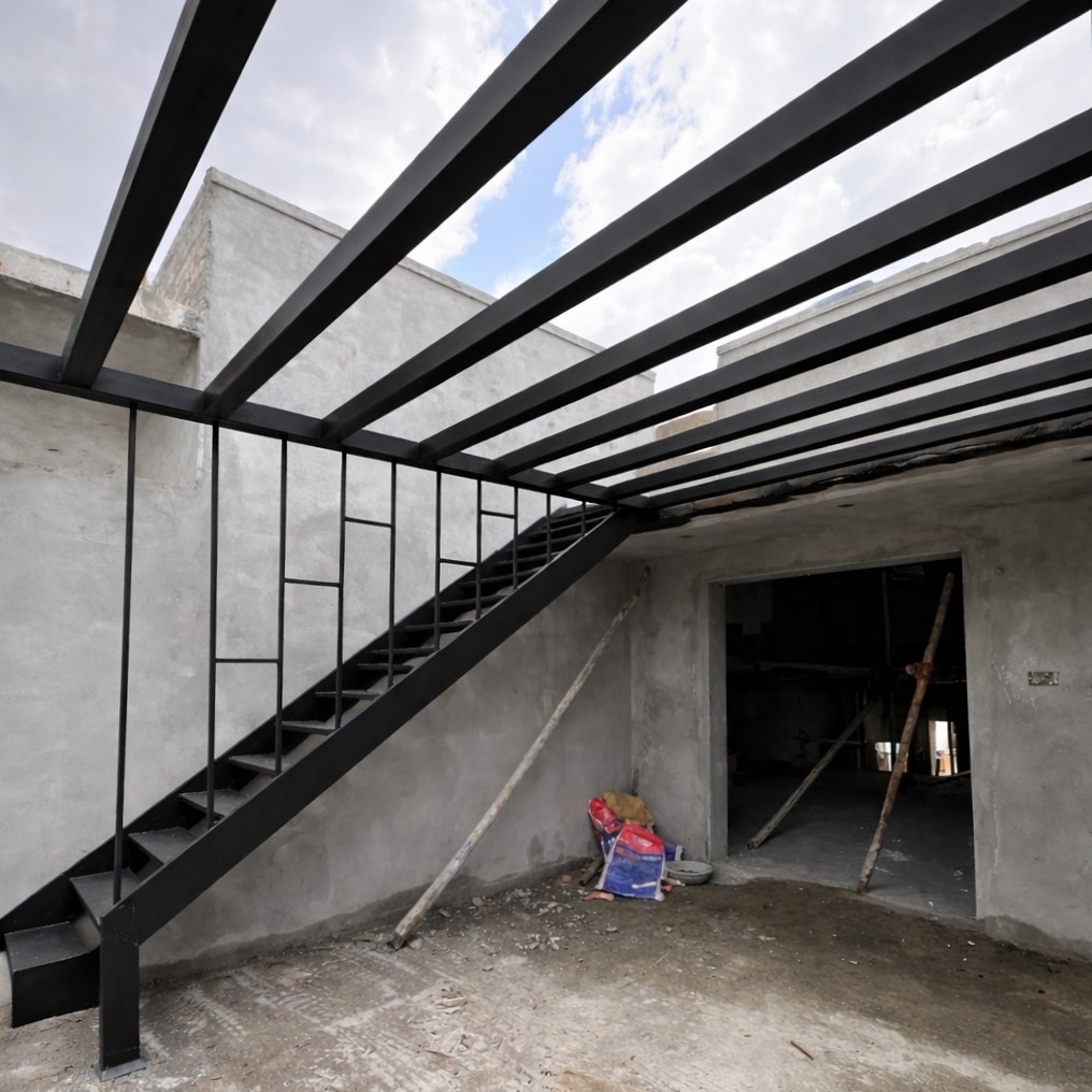 Matte black steel staircase with a minimalist pergola for a clean, modern exterior look.