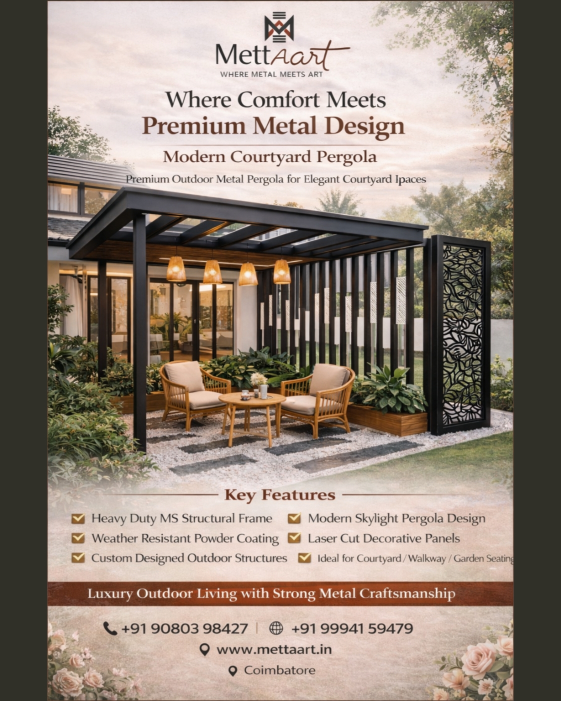 METTAART specializes in premium custom metal pergolas designed to enhance modern homes, villas, and bungalow courtyards. Crafted with heavy-duty MS fabrication and weather-resistant powder coating, our pergola structures combine durability, architectural beauty, and outdoor comfort. From courtyard pergolas and garden seating spaces to decorative laser-cut panels and luxury outdoor lounges, METTAART delivers bespoke metal designs that transform ordinary outdoor areas into elegant living spaces. Proudly fabricated in Coimbatore with precision engineering and artistic craftsmanship.