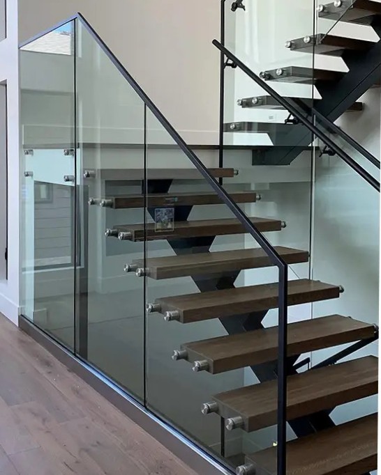 Floating wooden treads paired with sleek glass railing for a premium