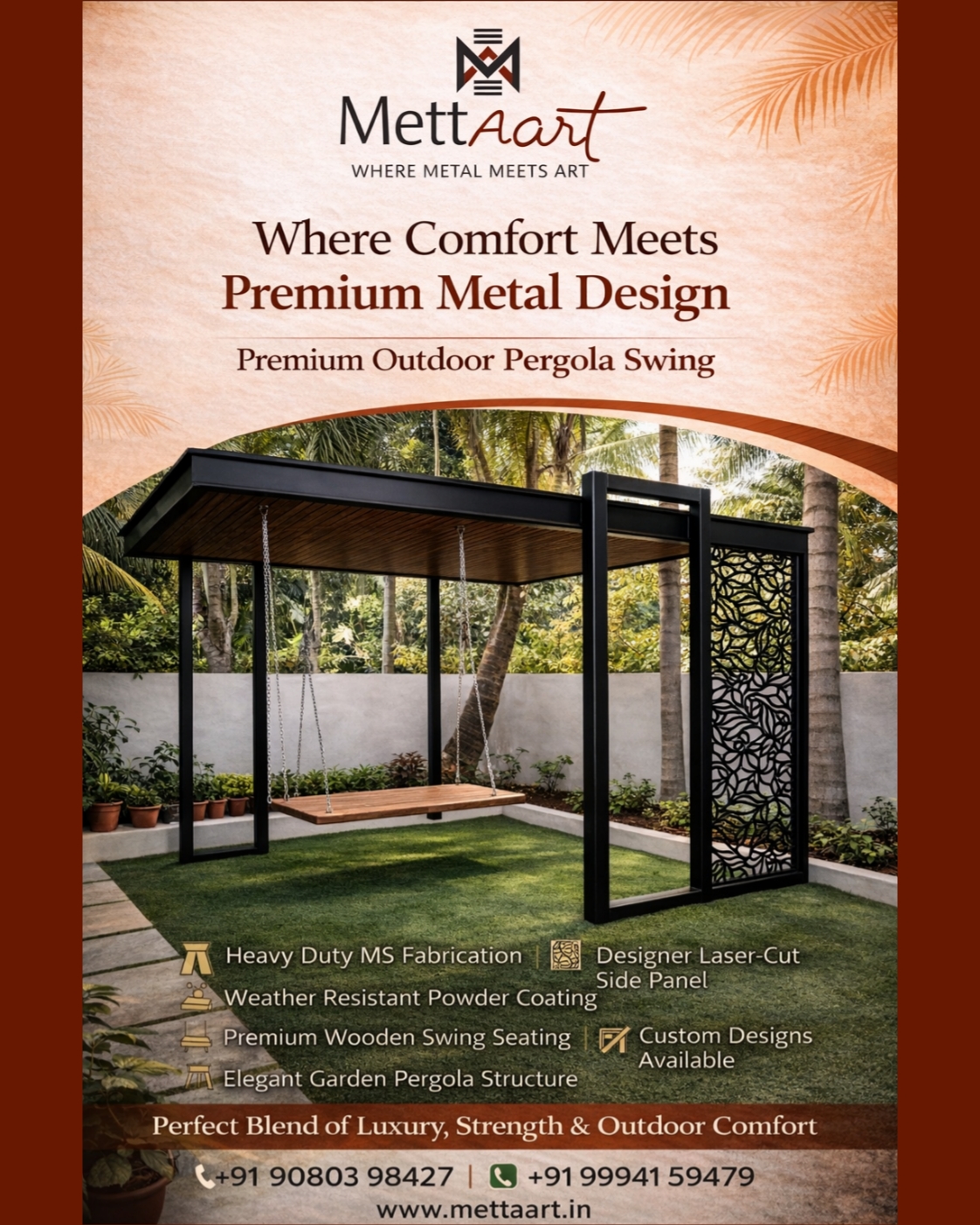 Upgrade your outdoor space with the Premium Outdoor Pergola Swing by METTAART, where comfort meets premium metal design. Crafted with heavy-duty MS fabrication, weather-resistant powder coating, and an elegant laser-cut metal side panel, this pergola swing adds a luxurious architectural element to gardens, villas, courtyards, and backyard landscapes.