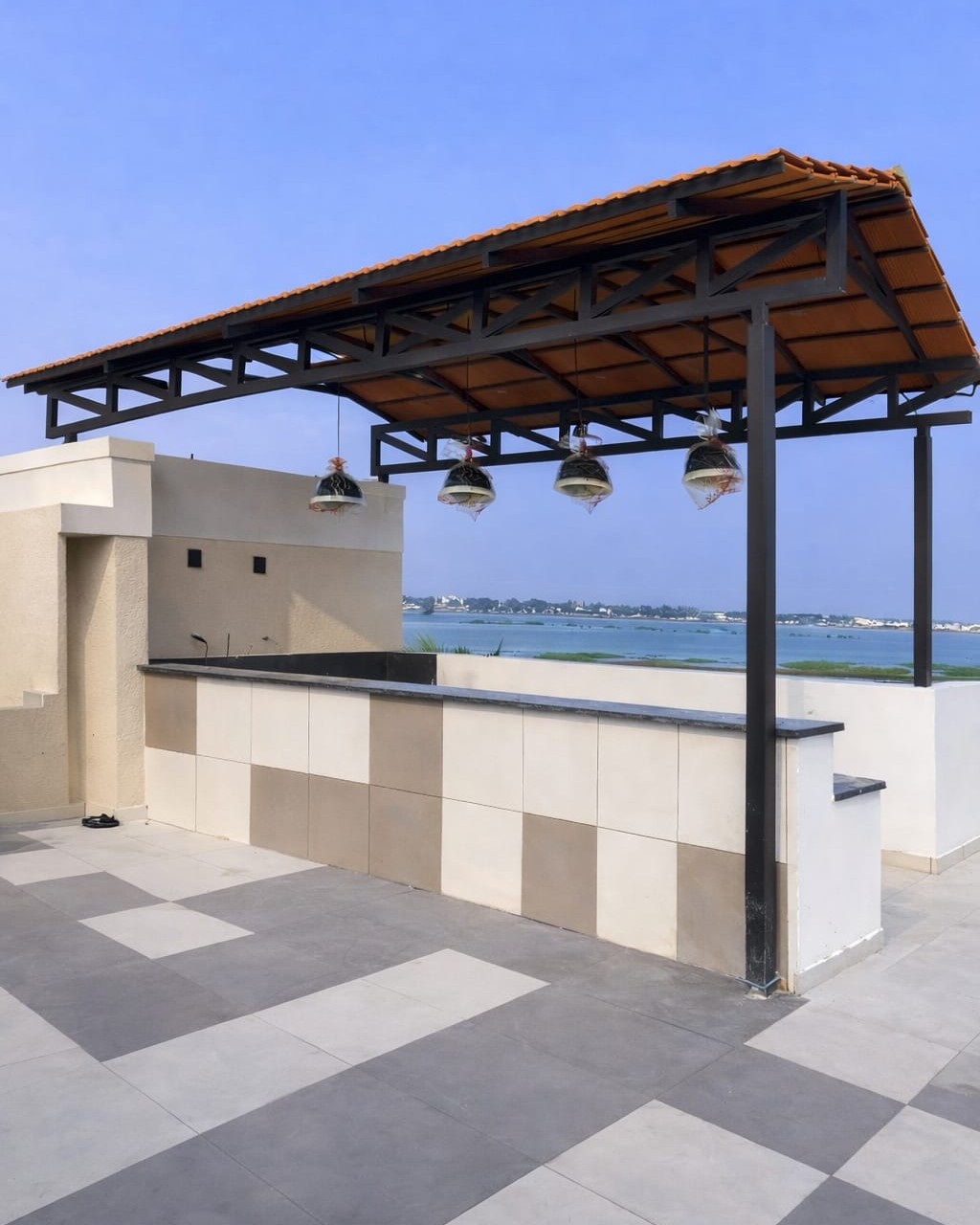 METTAART- Rooftop Pergola is a custom-designed rooftop pergola blends modern steel craftsmanship with functional elegance. The mono-slope tiled roof provides effective weather protection while maintaining an open, airy feel. Finished in a matte black steel frame with integrated hanging lights, the pergola transforms the terrace into a stylish outdoor living and entertainment space—built to last and designed to impress.