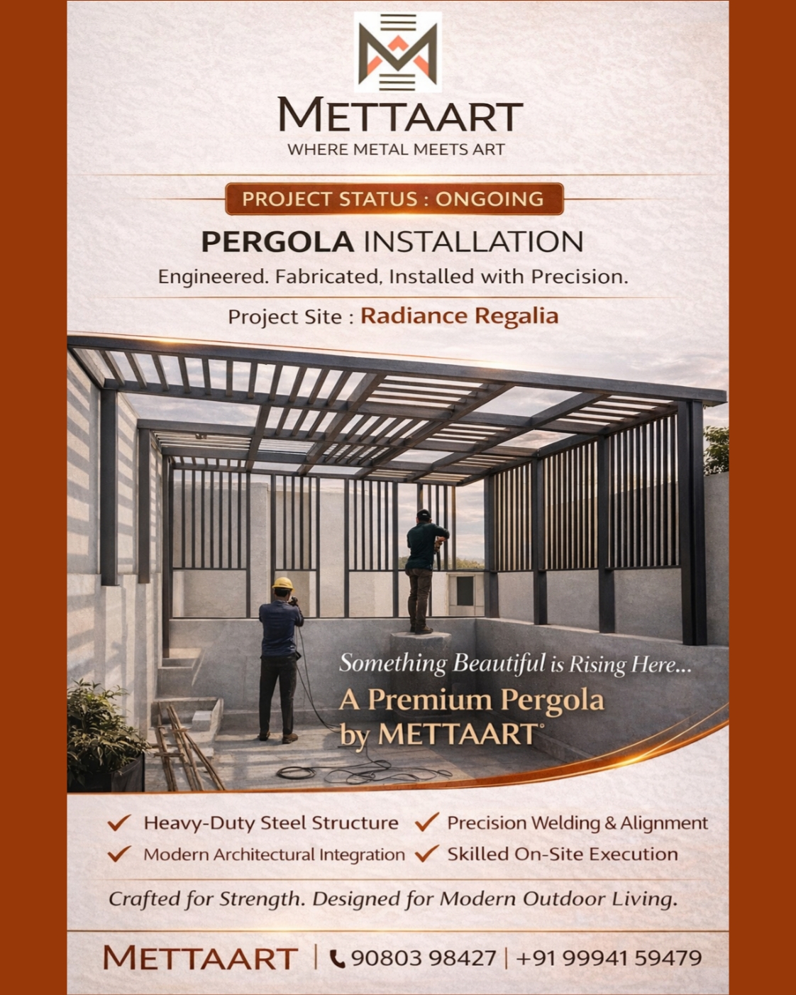 Premium MS pergola installation in progress at Radiance Regalia, Coimbatore, crafted with precision welding and modern architectural metal design by METTAART.