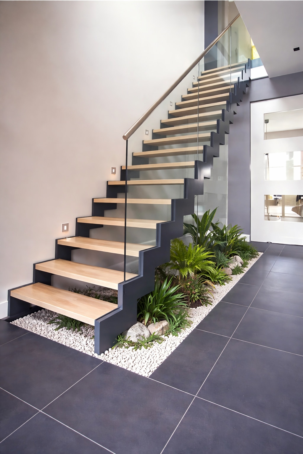 MEttAart - Everett Rise Floating Staircase is a refined expression of modern architecture, combining sharp geometry with visual transparency. Built around a single mild steel mono stringer, the staircase supports clean wooden treads that appear light yet solid underfoot. A full-height toughened glass balustrade enhances openness while maintaining safety, allowing natural light to flow uninterrupted through the space. Integrated step lighting subtly highlights each tread, creating a sophisticated ambience and enhancing nighttime usability. This staircase is ideal for contemporary homes where minimalism, structure, and elegance come together seamlessly. Perfect for: Luxury residences, villas, duplex homes, and modern commercial interiors.