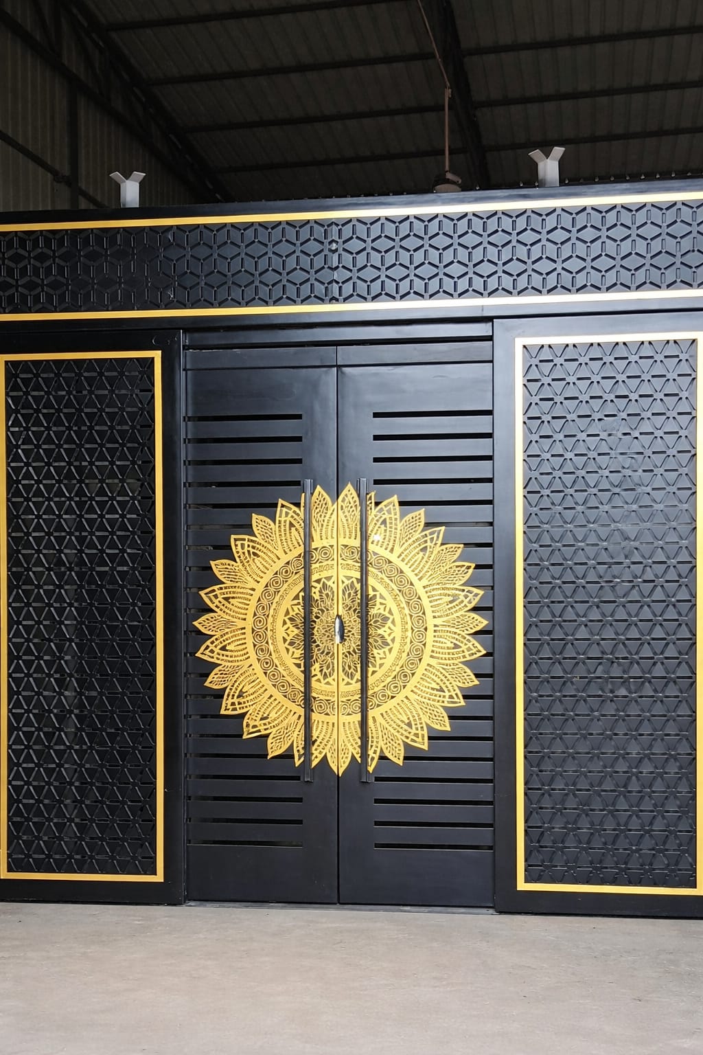Product Description – Fancy Sliding / Swing Gate This premium mild steel gate features a bold black base accented with elegant gold highlights, creating a striking balance of strength and luxury. The centre showcases an intricately laser-cut sun mandala motif finished in gold, symbolising power, positivity, and prestige. Flanked by geometric patterned panels on both sides, the design delivers a modern architectural appeal while maintaining traditional artistic depth. Built with precision fabrication and high-quality finishing, this gate is ideal for luxury residences, villas, and premium commercial entrances. Its robust construction ensures durability, security, and long-lasting performance, while the refined detailing makes it a true statement piece.