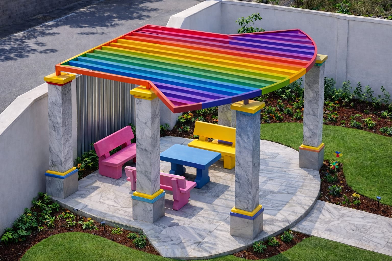 MEttAart - Kids Play Area Pergola -A lively and colorful pergola designed specifically for children, featuring a rainbow-hued roof and matching playful benches and table. Constructed with durable materials and marble-finished pillars, this outdoor space creates a safe, cheerful, and inviting environment for kids to sit, play, and socialize. Surrounded by greenery and a neat garden, it combines fun with comfort and style, making it a perfect addition to any playground, school, or backyard. 'Rainbow vibes, happy kids! 🌈🪁