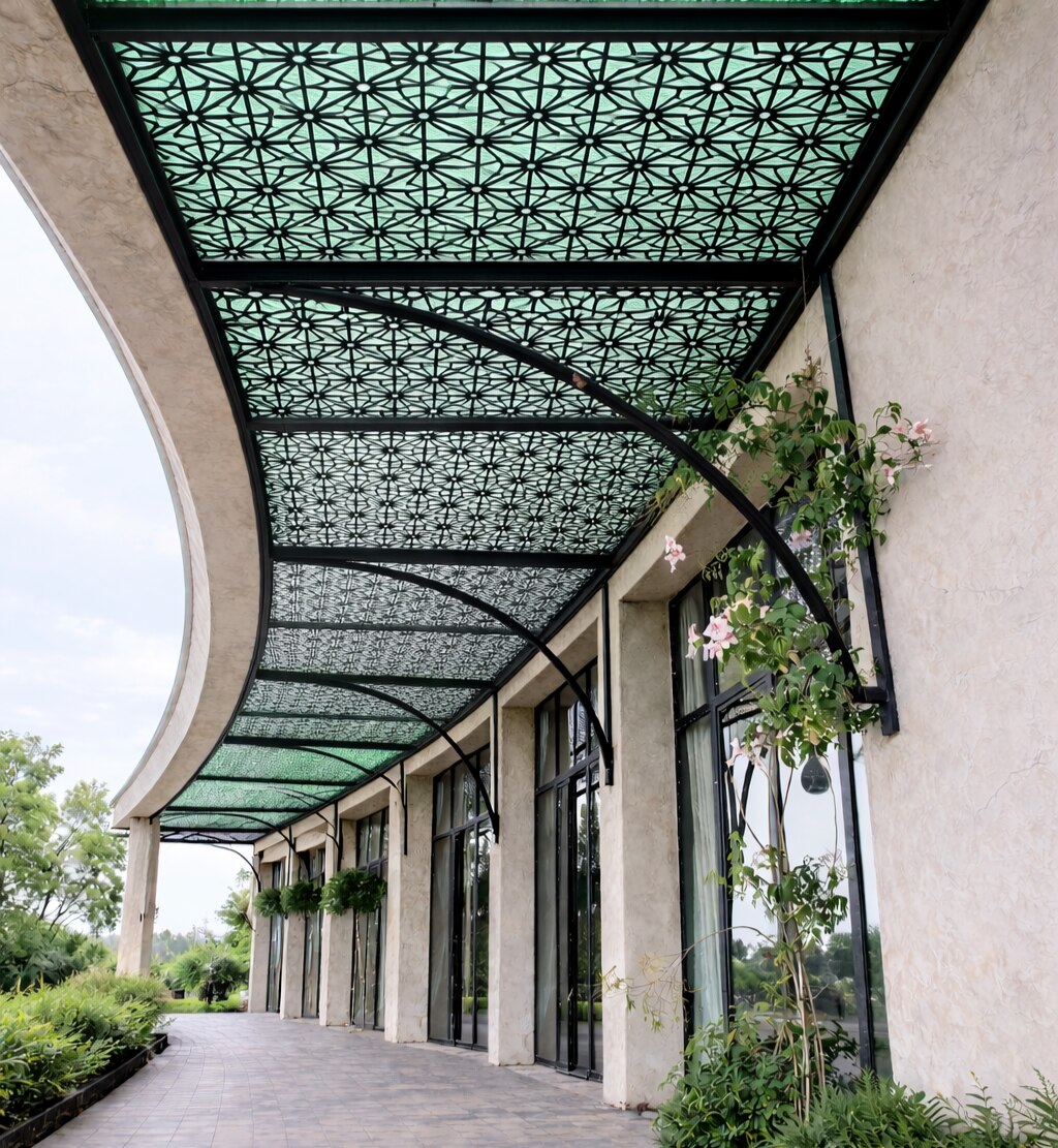Pattern below. Protection above. Perfect harmony. 💚 METTAART -Laser-cut MS pergola with embossed green polycarbonate roofing above, combining decorative detailing with weather protection and filtered natural light. Modern, durable, and architecturally refined.