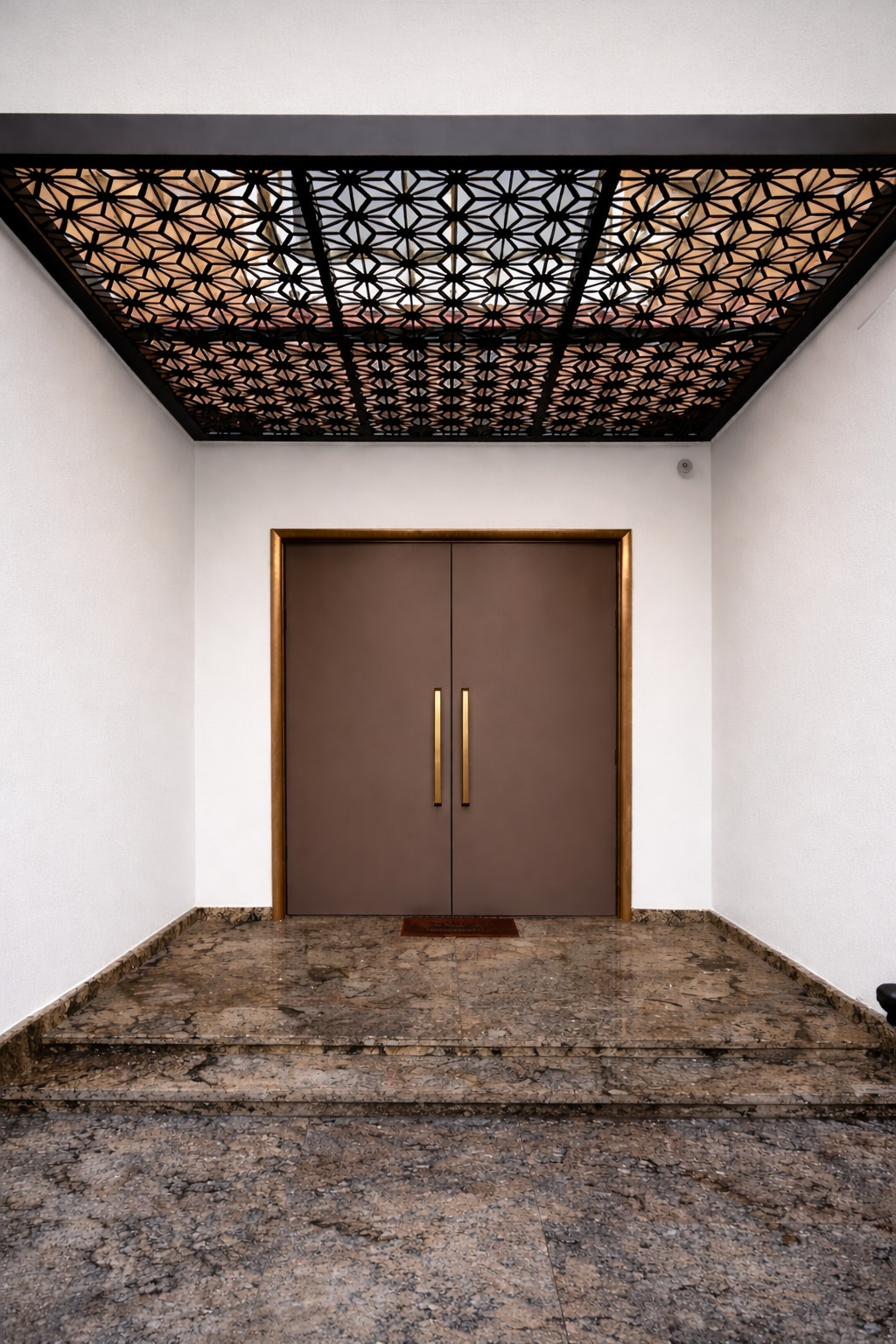 METTAART - Modern Laser- Cut Pergola, Transform your entrance into a statement space. This laser-cut metal pergola ceiling adds elegance, shadow play, and a premium architectural look to your home entrance.