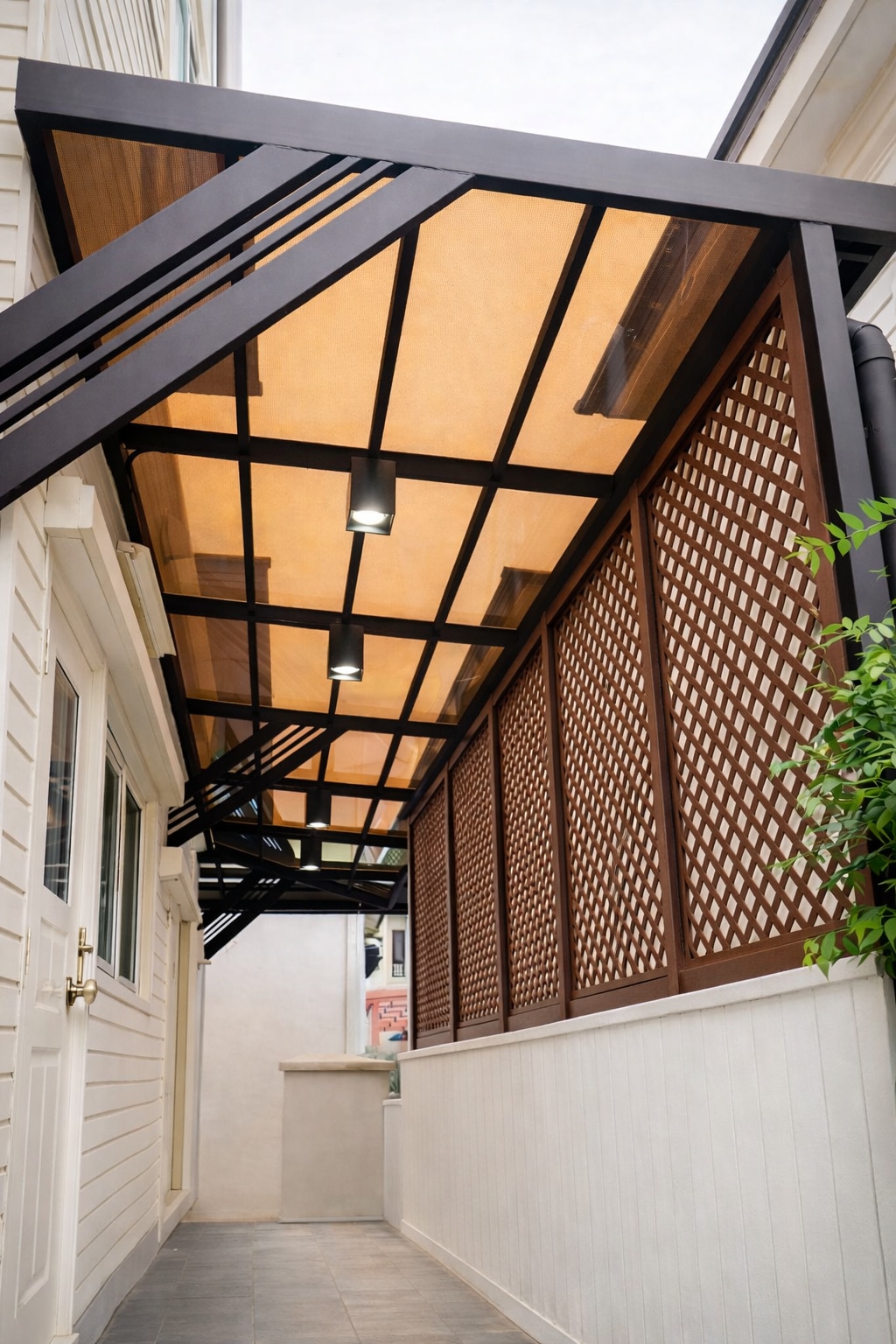 METTAART - modern entrance pergola design features a strong MS steel framework with a polycarbonate sheet roof, providing protection from sun and rain while maintaining natural light. The side elevation is enhanced with brown diamond PVC lattice panels, creating an elegant privacy screen and decorative facade element. Perfect for side walkways, entrance passages, courtyard covers, and modern house pergolas, this design blends strength, durability, and aesthetics. The black metal pergola frame combined with warm lattice patterns creates a premium architectural feature for contemporary homes.